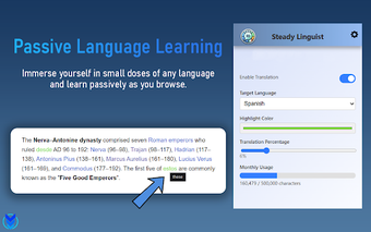 Steady Linguist, Chrome tarayıcı eklentisi olarak, kullanıcıların bir web sayfasındaki kelimelerin belirli bir yüzdesini otomatik olarak çevirmesine olanak tanır. Bu sayede, kullanıcılar yeni bir dil öğrenirken, daha doğal bir deneyim yaşarlar. Eklenti, kelime çevirimi için özelleştirilebilir yoğunluk, dil ve vurgulama stili sunarak, okuduğunuz web sitelerinde yeni kelimeleri doğal bir şekilde öğrenmenizi sağlar. Kullanıcı deneyimini bozan reklamlar, pop-up'lar veya sınavlar olmadan, akıcı bir şekilde dil öğrenme imkanı sunar.